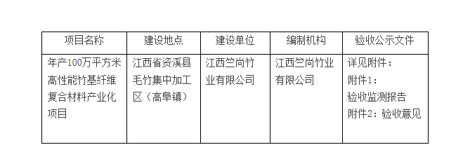 2019年7月18日,江西竺尚竹业有限公司在江西省资溪县组织召开了“年产100万平方米高性能竹基纤维复合材料产业化项目”竣工环境保护验收会,参加会议的有江西资溪县环保局、江西竺尚竹业有限公司、江西动力环境检测有限公司等单位和邀请的3名环保技术专家共8人,组成了验收组。