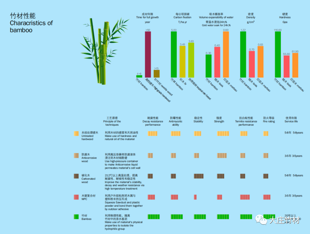 竹材成材快,从竹笋到成材只需两三个月,生长周期是松木 的 1/120。在使用期过后,材料可以100%被回收并再次利用。竹材是一种低能耗的建筑材料,当建造相同面积的建筑时,竹材与混凝土的能耗比1∶8,与钢材的能耗比为 1∶50 。如果每年全球使用6亿吨竹子替代PVC产品,预计将减少40亿吨二氧化碳。