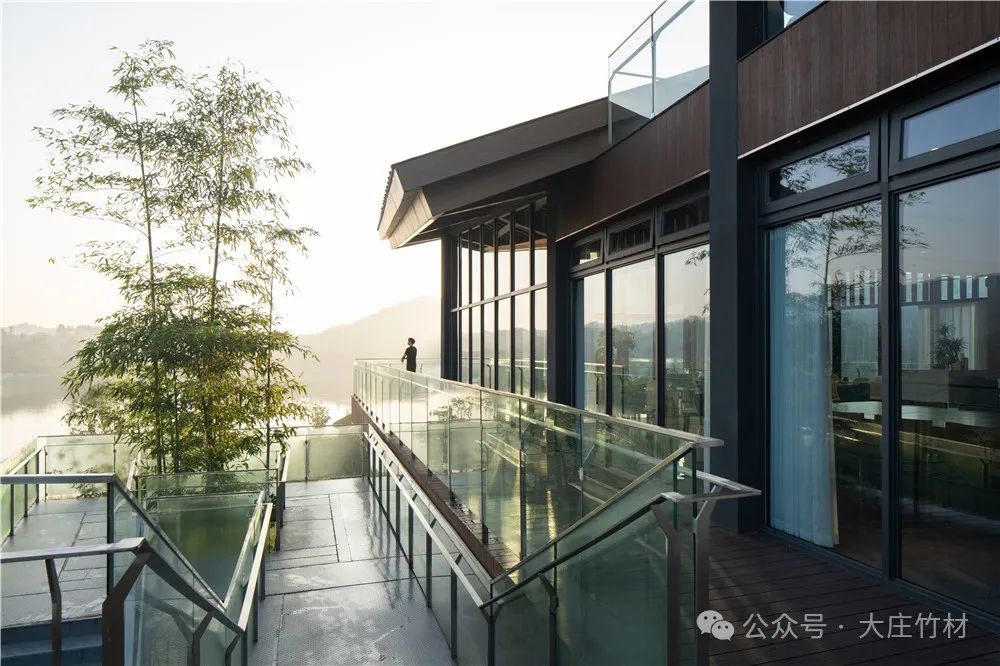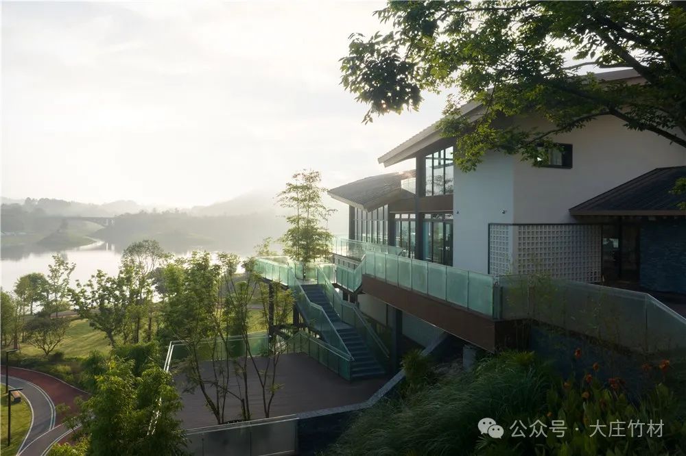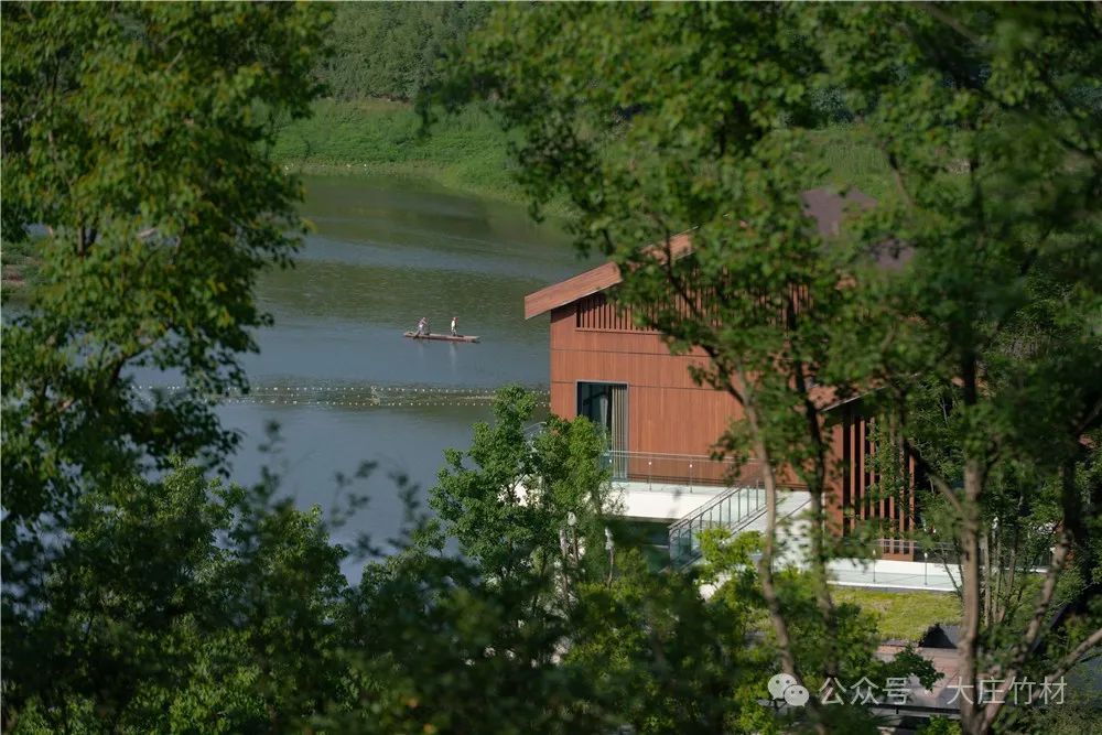 在材料的选择上,设计团队依托本真和自然的设计理念,选用大庄瓷态®竹材,以竹材浅色为主色调,整体基调与湖水水位降低后裸露出的岩土相得益彰,素雅的浅色墙面和瓷态®形成视觉反差,吸引湖对岸来访者的视线。镂空的墙体、瓷态®格栅与虚实有序的开窗节奏形成一幅自然画卷。