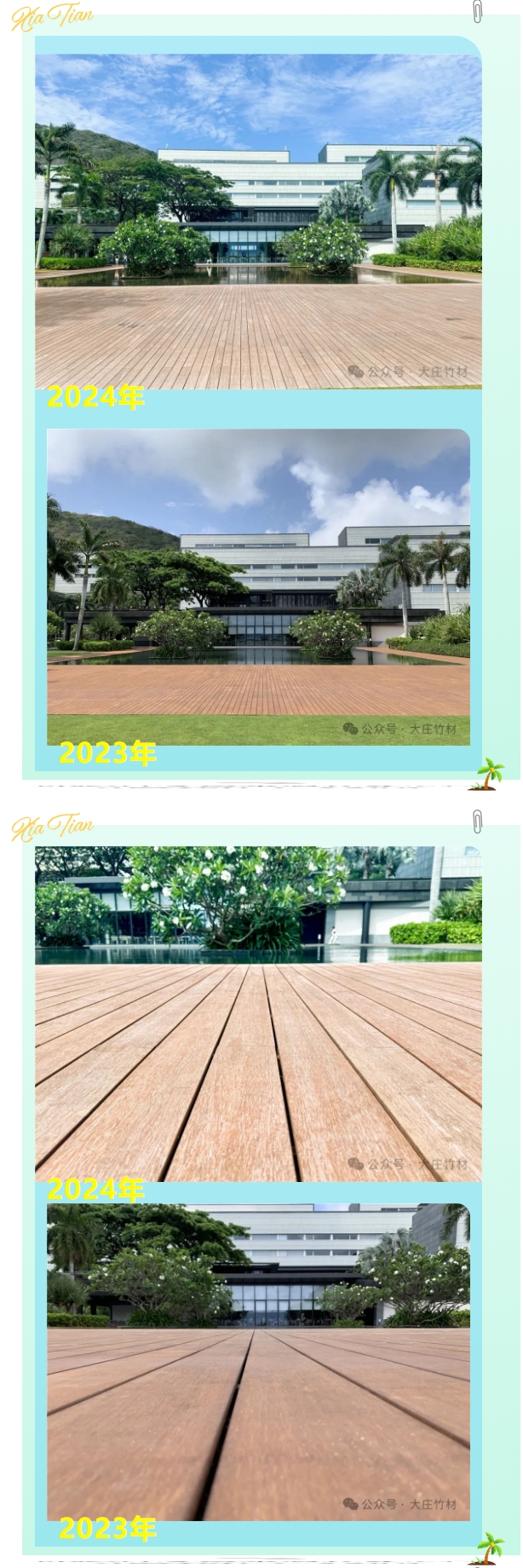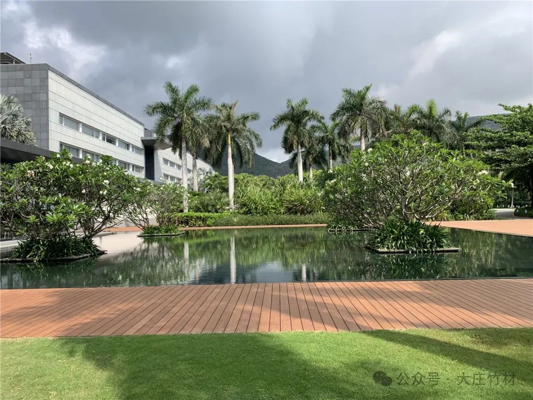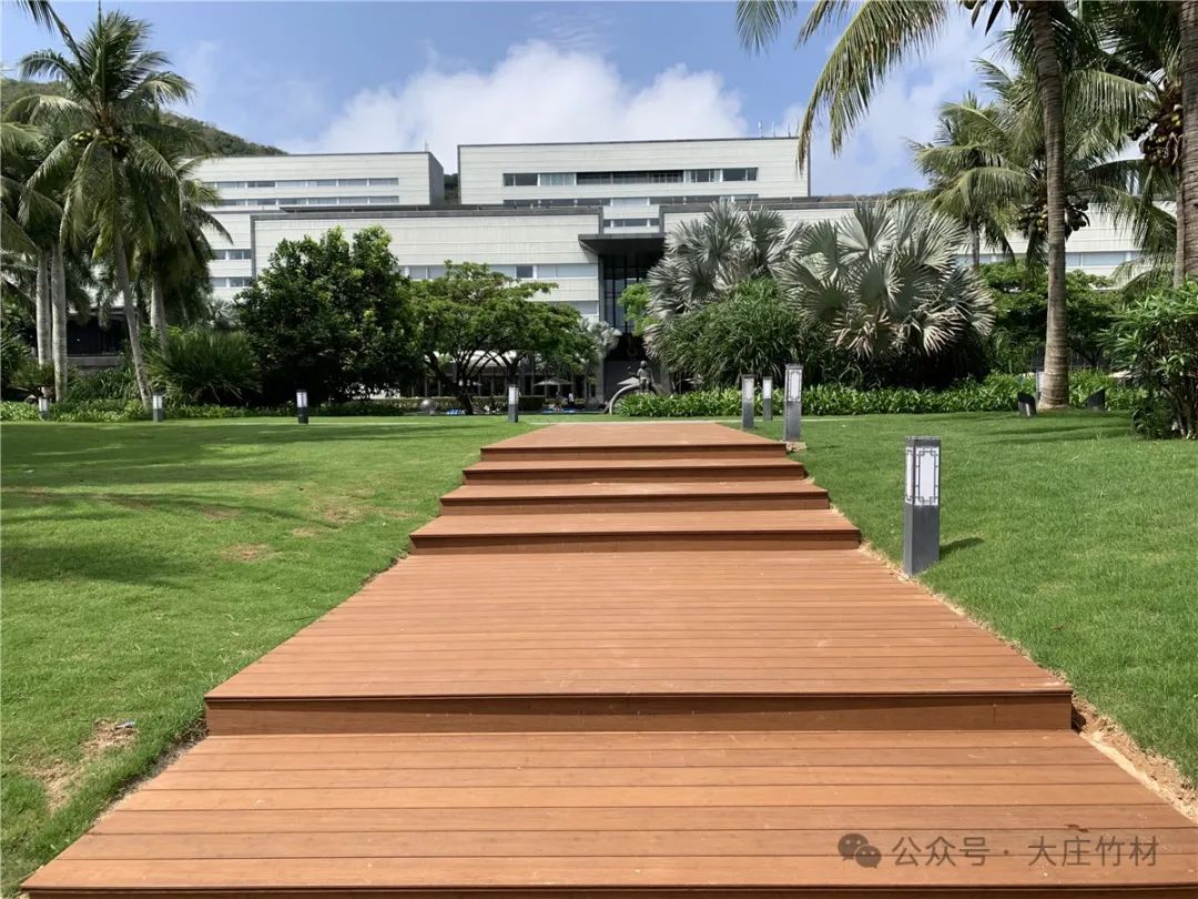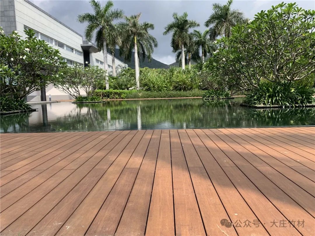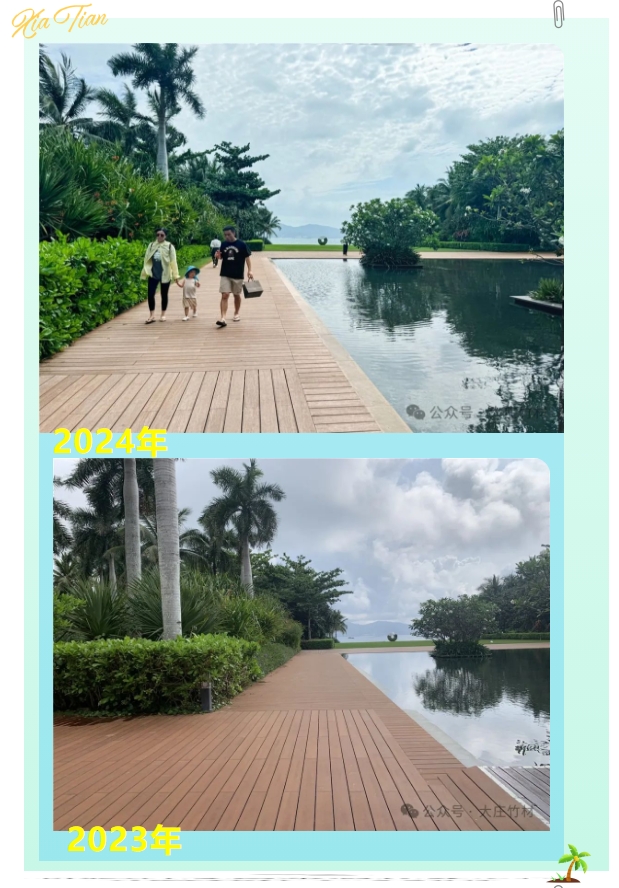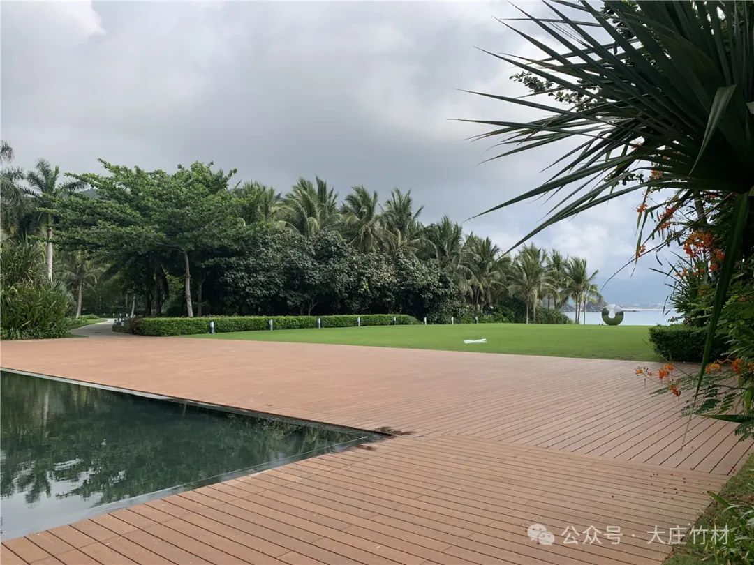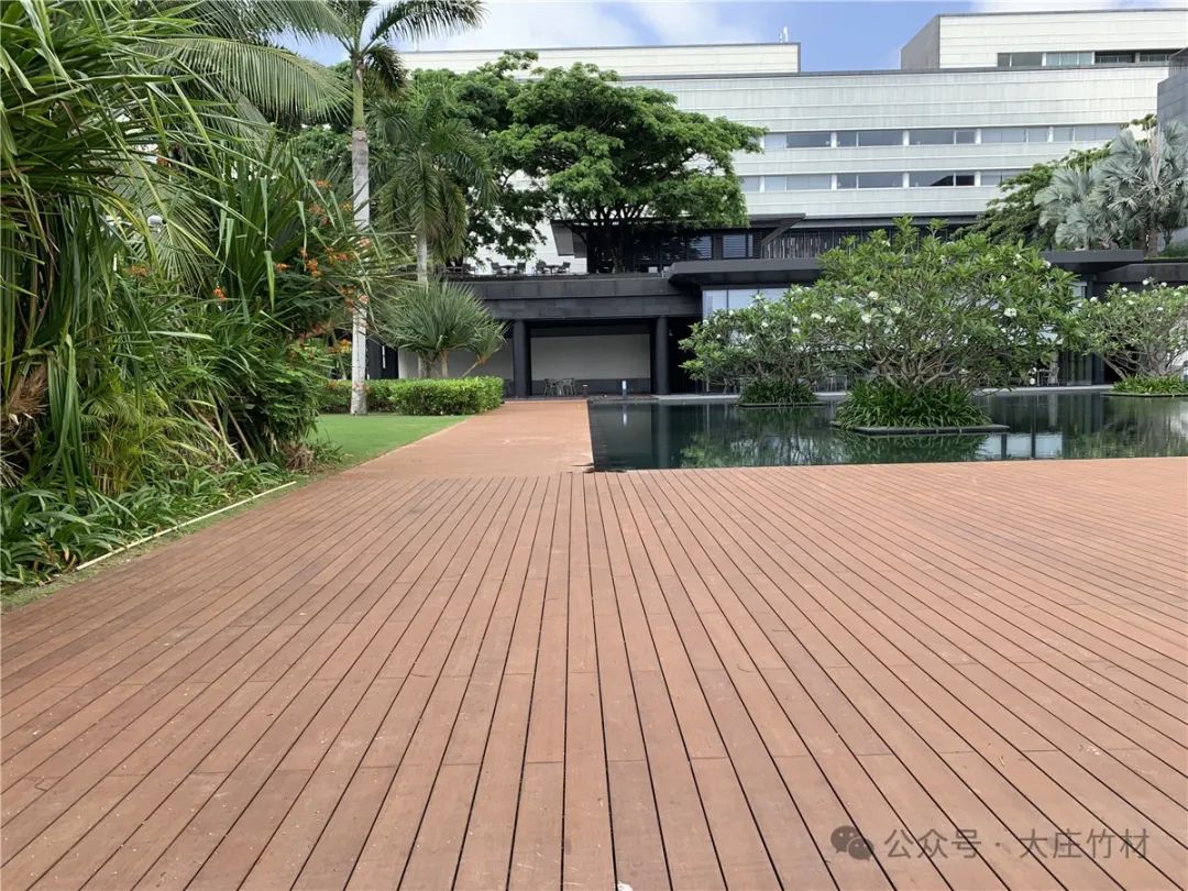 酒店投入使用几年后,原本选用的户外材料或开裂或起翘,在2023年,酒店外围栈道翻新选用大庄®竹户外地板瓷态®PLUS,长度达到3050mm,比市场上常见的1860mm更长更宽。这种超长规格不仅提升了视觉效果,还减少了接缝,提高了地板的稳定性和耐久性。在繁忙的酒店环境中,瓷态®3050表现出了极高的耐磨性和抗压性,为客人带来更舒适的行走体验。