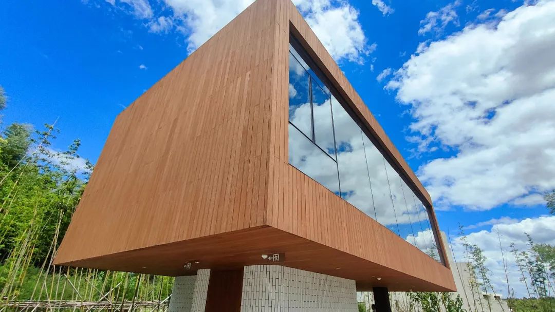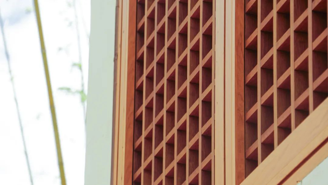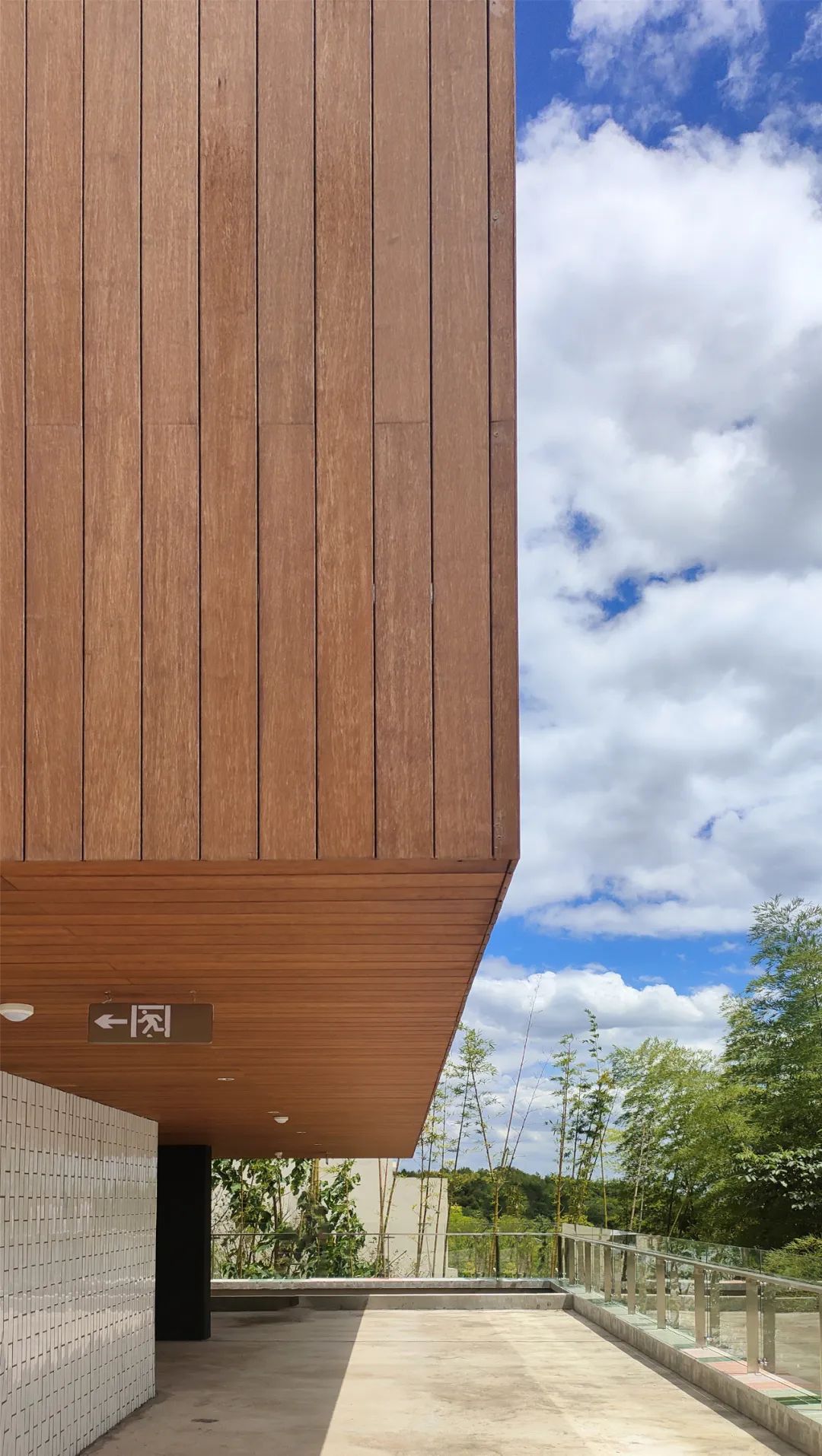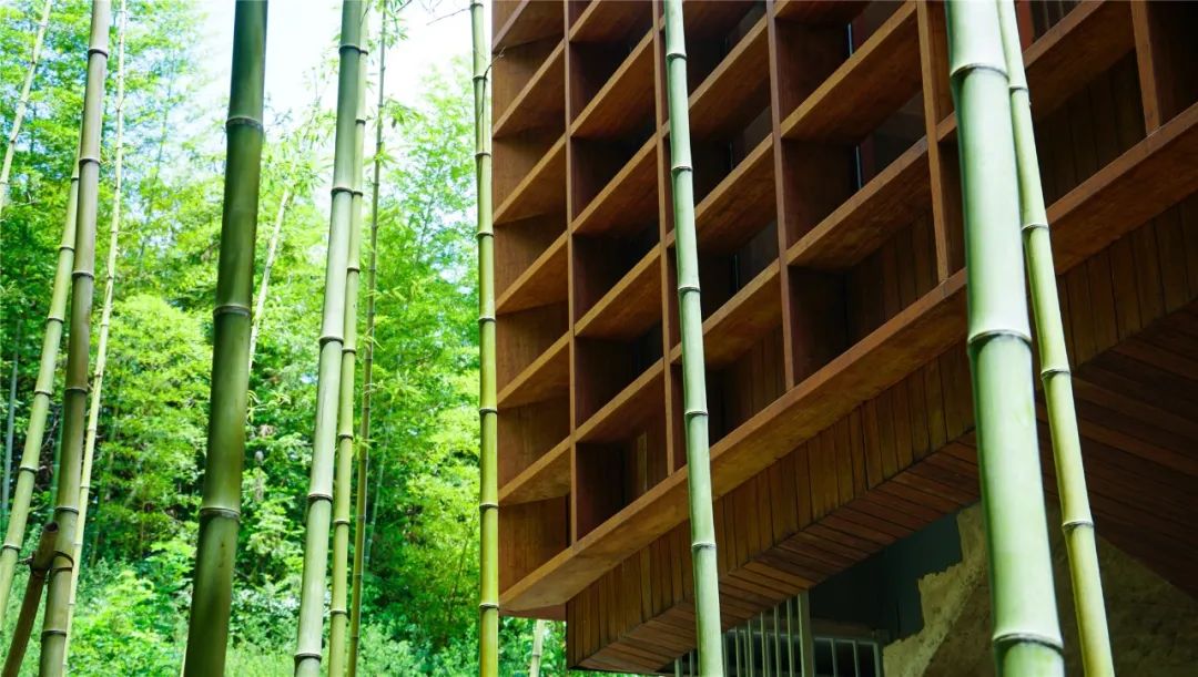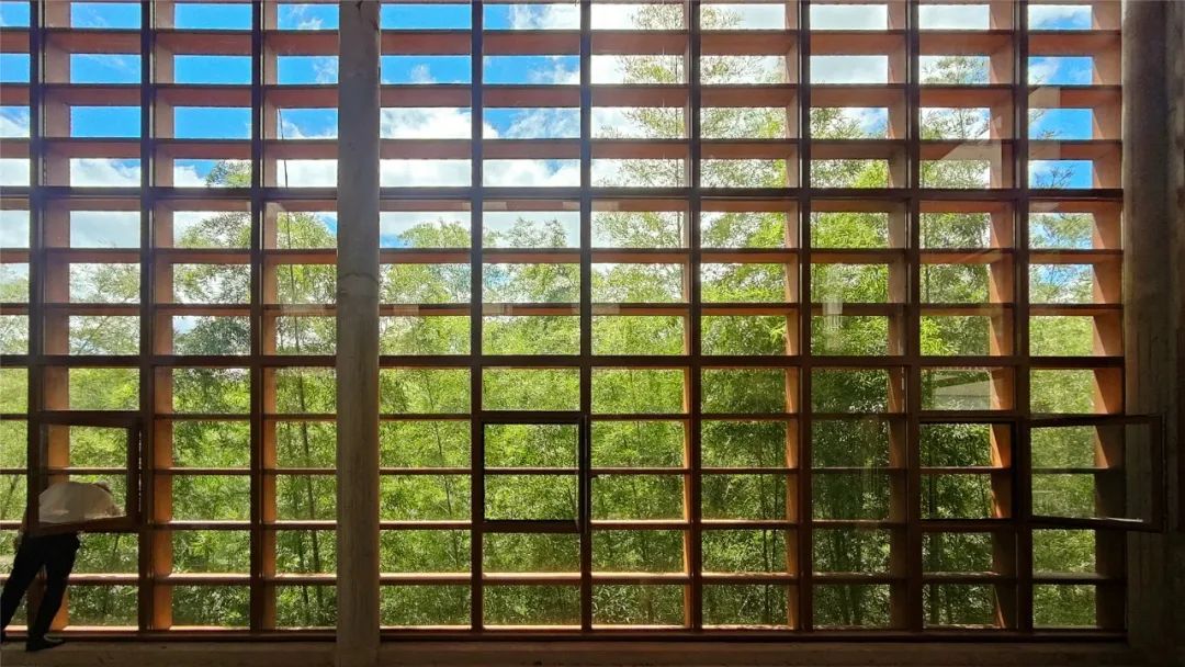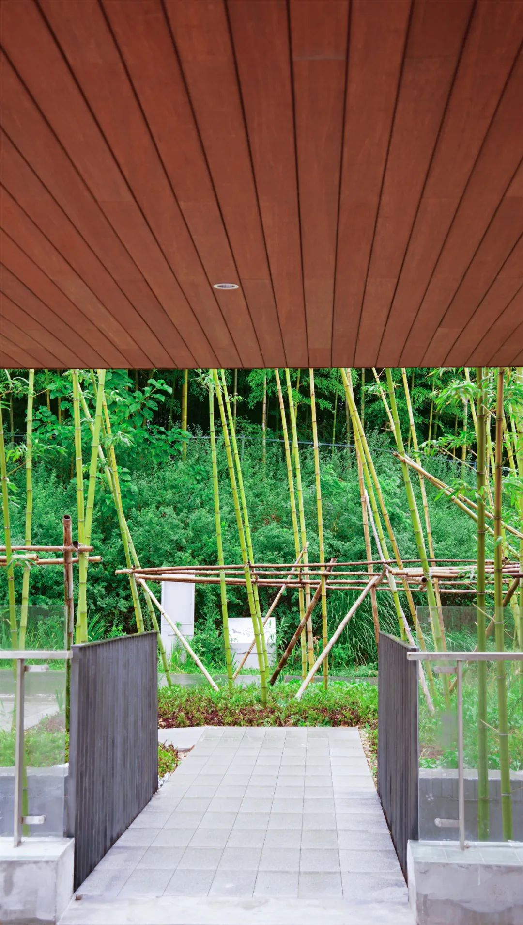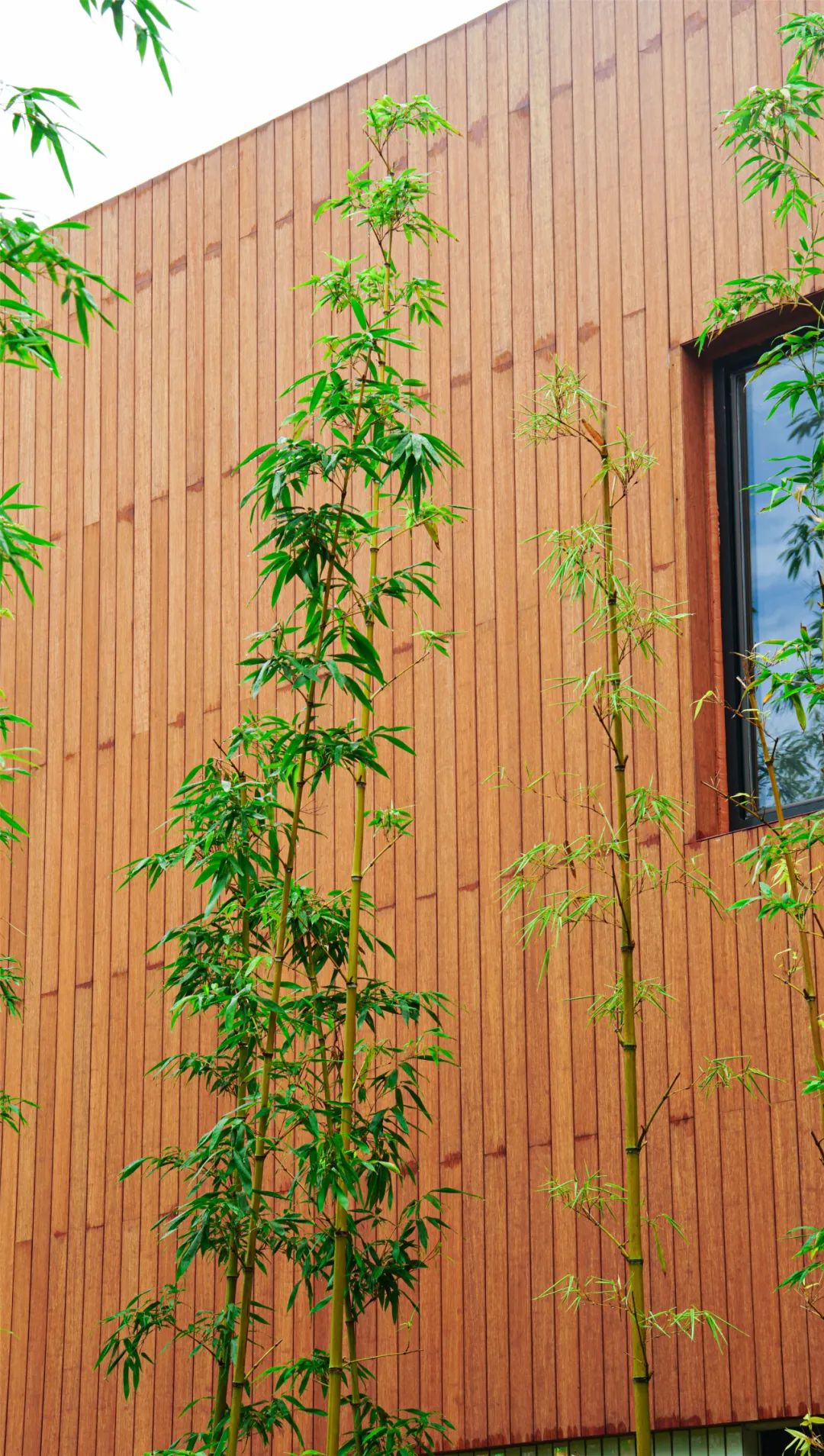 建筑外立面采用大庄定制竹格栅板,以天然竹纹肌理呼应山峦起伏的轮廓。阳光穿透格栅,在室内投下流动的光影,实现“以竹为帘,引景入室”的空间韵律。